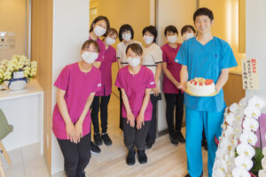 写真は開業時にスタッフよりお祝いのケーキを頂いたものです。スタッフの心遣いに感謝しつつ、チームとして地域の皆様の健康が世界一になれるよう尽力していきたいと思います。